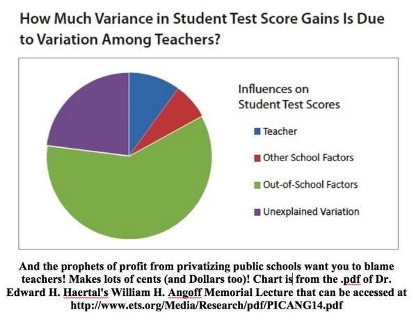 (9) How much of a students’ test score is down to the teacher? (Or in other words, can you assess the worth of a teacher based on the performance of the student?) – Apparently, about 15% or so. Larry Ferlazzo shared the graphic on the right, taken from an ETS sponsored lecture by Dr. Edward H. Haertal. ETS are the providers of the TOEFL exam series, and while the lecture (downloadable in pdf via Larry’s post) makes it quite clear that the research relates to an investigation of a specific teacher assessment measure used in US education – it raises yet more interesting questions to throw into the testing debate.