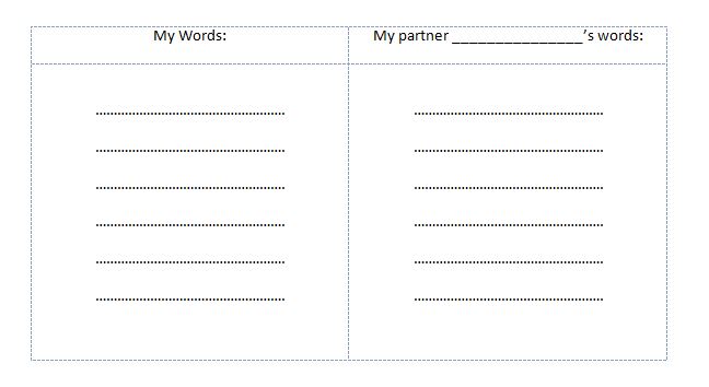 So, assuming you have chosen your twelve words, divide them up into a set of six for student A and another set of six for student B. Give each student their words written down on a table like this one: