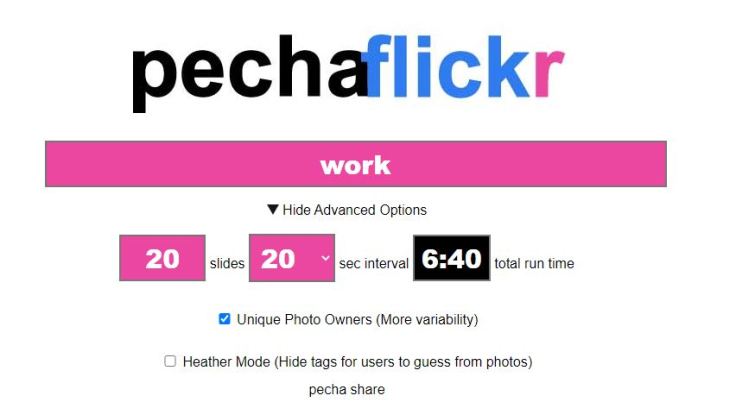 What pechaflickr does, if you aren’t familiar with it, is show you 20 random images for 20 seconds each. The challenge is to try and tie them all together into a connected presentation. You can enter a theme word, for example “work”, and the software pulls up images from the Flickr site that have been tagged with that word.
